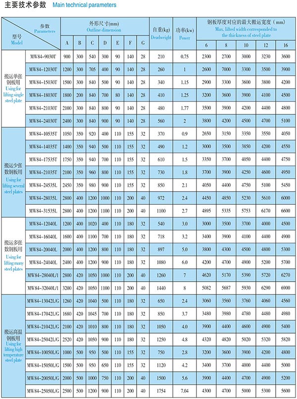 本系列產品是專為吊運中、厚鋼板而設計,磁路設計,適合于中厚板廠、造船廠、機械制造廠,用戶可根據自身要求選用單張系列(300型)、少張數系列(350型)、多張數系列(400型),少張數型和多張數型可采用調磁控制方式,能保證起吊一張或多張鋼板并單張放料,由于長鋼板在搬運過程中容易產生彎曲變形,故選用電磁鐵時宜多臺聯用。對于長中厚板(6mm-32mm)電磁鐵間距多取3-4m,兩端外伸部分的長度可小于或等于其間距的二分之一,作業時鋼板彎曲變形將影響安全搬運,選用時應注意電磁鐵的長度與鋼板厚度對應的搬運寬度的對應參數,不宜超過,尤其是吸吊多張鋼板的情況。