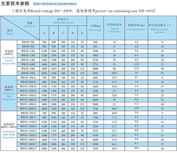 1、根據整塊鋼坯導磁率的特點而設計的磁路,消耗功率小,自重輕,起吊能力大,安全可靠。